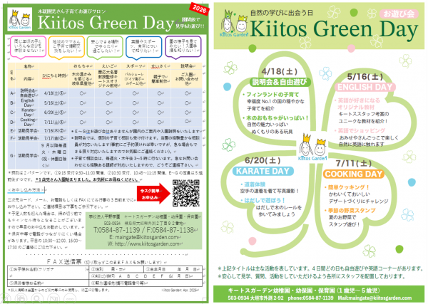 2026年度の未就園児さんお遊びサロン「キートス・グリーンディ」(旧「キートスライブ」)の日程をご案内します(PDFはこちら→2026キートスグリーンディチラシ)