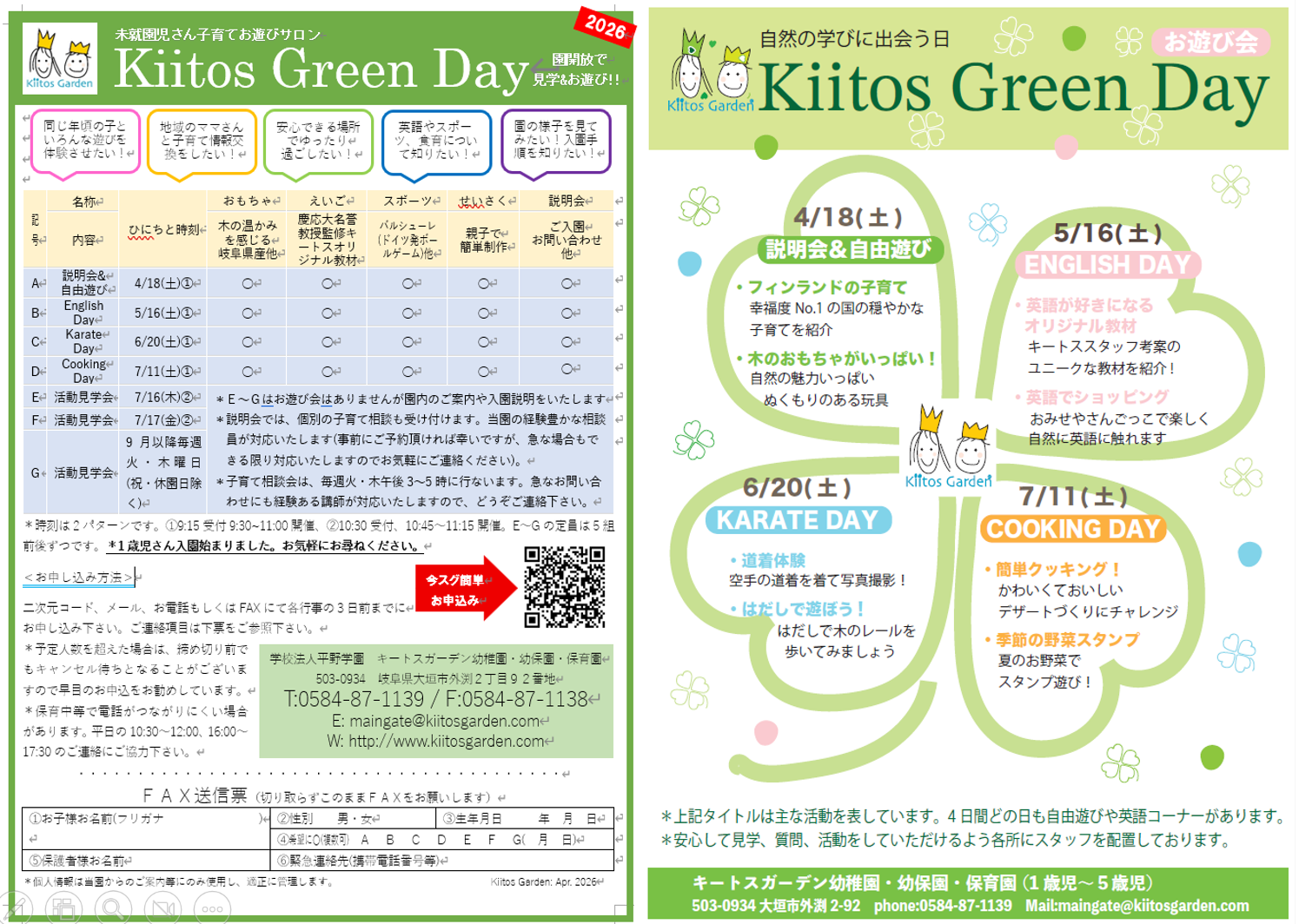 木のおもちゃ、英語、スポーツ、制作活動の他、入園説明会も行ないます。年齢等の制限はありませんが、事前のお申し込みをお願いします。