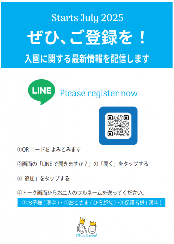 2025.12.10 その他 入園前保護者様のLINEご登録について 入園前保護者様のLINEご登録は、以下の二次元コードをお使いください。 どうぞよろしくお願いいたします。 Kiitos! < PREVIOUS一覧へ戻る New 2025.12.10 入園前保護者様のLINEご登録に… 2025.12.10 Instagramご登録について 2025.12.9 書初め in 冬の「キートス・コ… 2025.7.19 本年度中のご入園ご希望の方へ(個… 2025.7.19 2024(令和6)年度4月ご入園… Category 食育 Kiitos New Normal Project 英語 自然 幼稚園部・幼保園部 ストロベリー&ピエニ イベント 入園について キートスライブ Koulu KE+ その他 おすすめ本 Archive 2025 2024 2023 2022 2021 2020 2019 2018 2017 2016 2015 2014 2013 2012 2008 2007 2005